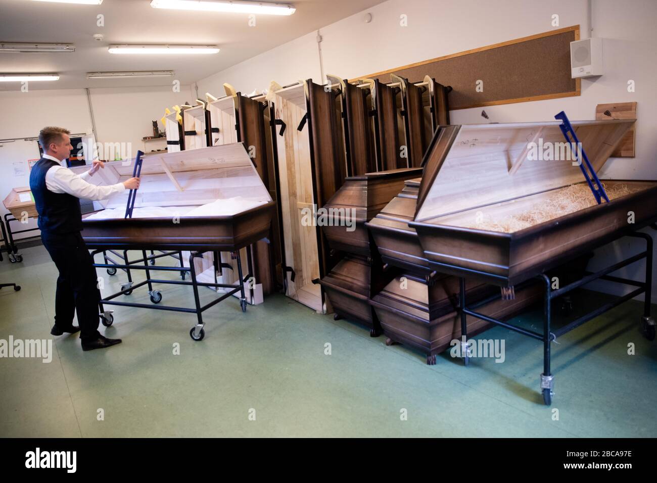 Hamburg Germany 30th Mar 2020 Brian Johansen Undertaker Prepares Coffins In A Workroom Of The Seemann