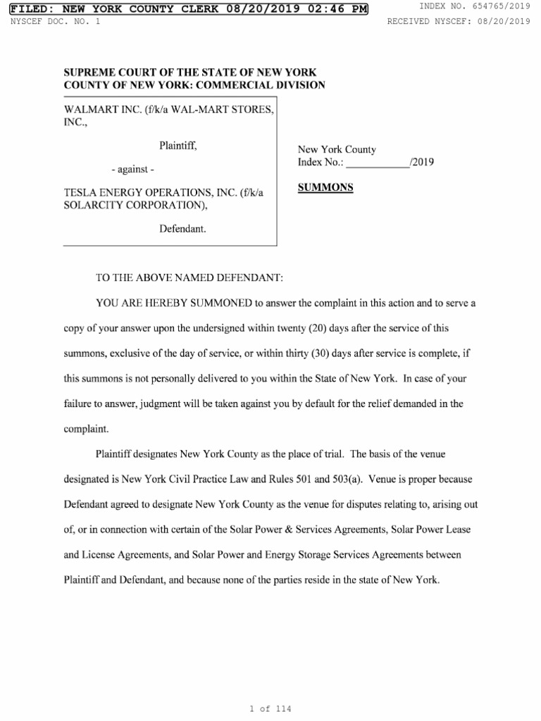 654765 2019 Walmart Inc V Tesla Energy Operations Inc Summons Complaint 1 Solar City Solar Cell