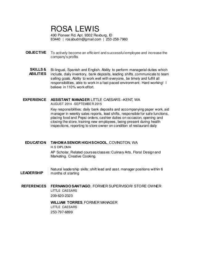 Verify that prepared food meets requirements for quality and quantity. Performs the task associated with food paper labor and utility cost controls and monitors shift activities to ensure compliance. Crew Member Aug 2014 Present Little Caesars Colorado Springs CO.